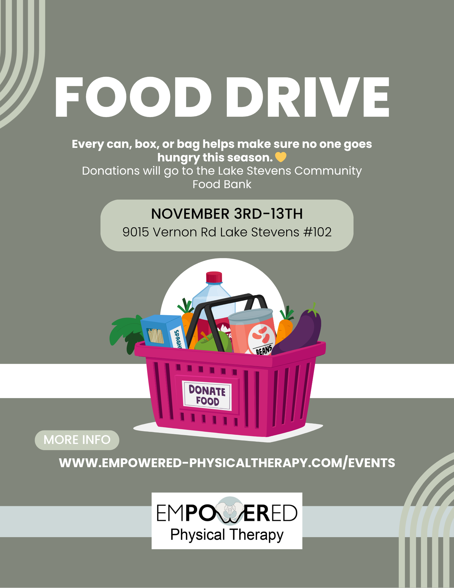 We’re collecting nonperishable food to support families in our community through the Lake Stevens Community Food Bank. Drop off donations at Empowered Physical Therapy between November 3rd and 13th. Every can, box, or bag helps make sure no one goes hungry this season. 💛